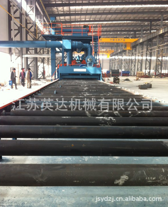主要由輥道輸送系統(tǒng)、拋丸清理機(jī)、拋丸除塵系統(tǒng)、和電控系統(tǒng)所組成。其工作原理是:由輸送輥道送至封閉的拋丸清理室,,利用拋丸器高速旋轉(zhuǎn)的葉輪將鋼絲切丸(彈丸)加速拋射至工件表面,對(duì)工件表面進(jìn)行沖擊、刮削以清除工件表面的鐵銹和污物,然后利用橫掃、滾刷、收丸螺旋和高壓吹管將工件表面的積丸和浮塵吹掃干凈,由送出輥道送出,從而使鋼材達(dá)到除銹、防銹的目的。